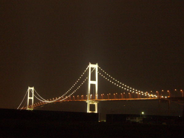 今、ライトアップされた橋がフロントガラスにいっぱいに。
