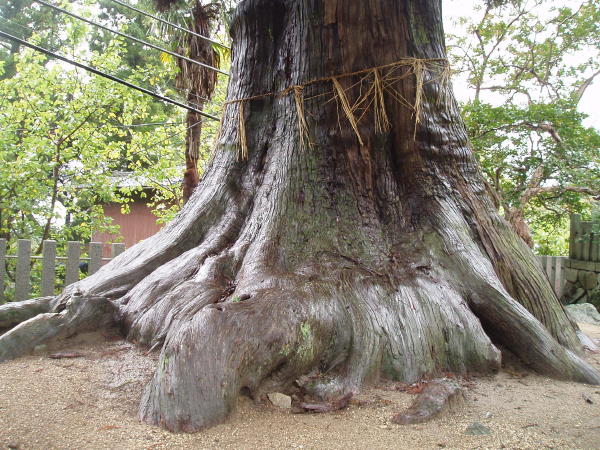 看板を見れば、周囲7m80cm、高さ36m50cm。樹齢約700年とのこと。雨に濡れてツヤツヤで、根っこのそのゆるぎない存在感に圧倒されました。人間なんて、本当にちっぽけですね。